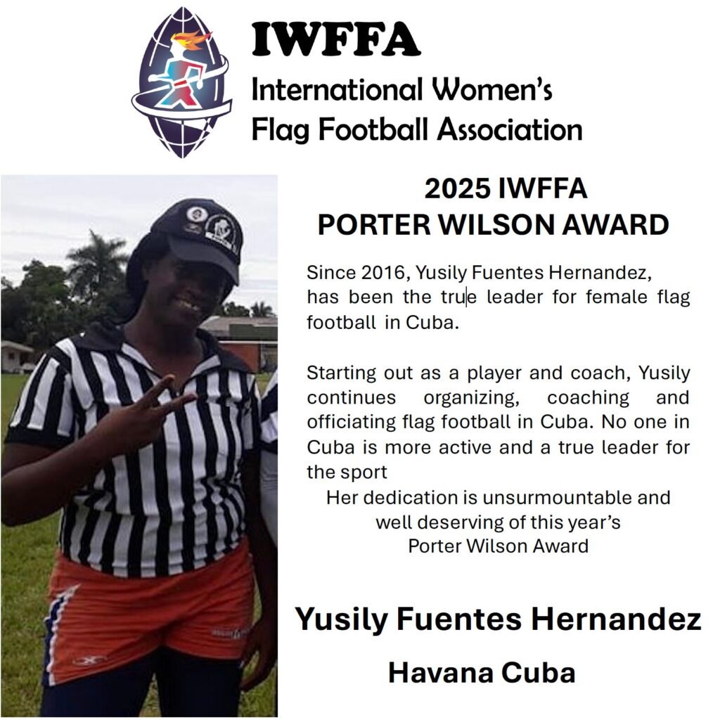 Home Page Tournament Result Event Page IWFFA SPECIAL AWARDS PORTER WILSON AWARD IWFFA'S MOST PRESTIGEOUS AWARD THE SPORTSWOMAN & GIRLS LISTED BELOW ARE RECOGNIZED FOR THEIR ELITE ATHLETICISM FOR YEAR 2025