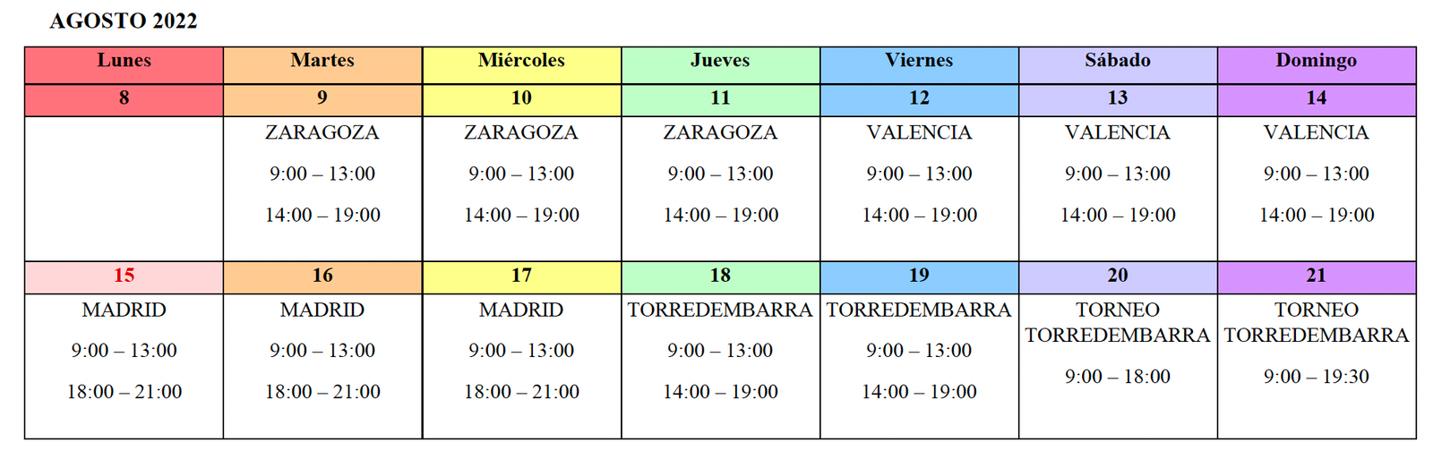 En los tres días en los que permaneceremos en dicha ciudad y durante los horarios citados anteriormente se realizarán entrenamientos específicos de Flag Football IWFFA 8×8. A continuación, aparece desarrollado lo que se realizará en cada jornada, que serán en bloques de dos horas, dando disponibilidad a las jugadoras de participación según convenga. Por otro lado, para trabajar de manera más individualizada y específica se realizarán agrupamientos de 12 jugadoras como máximo en cada bloque horario.