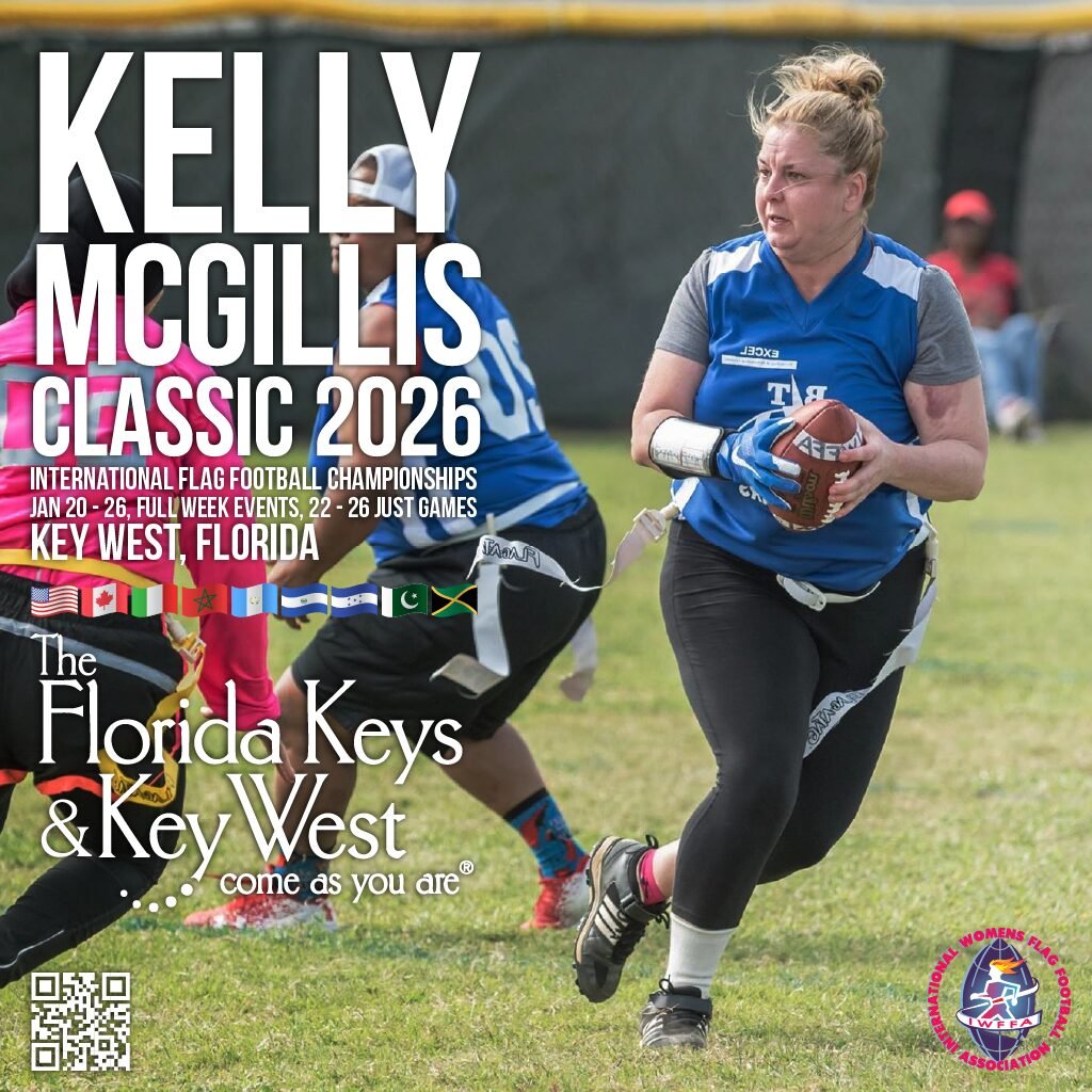 Past Tournament Results 2025 2024 2023 2022 2015 2014 2013 2012 2011 2010 2009 2008 2007 2006 2005 2004 2003 2002 2001 2000 1999 1998 1997 2026 IWFFA TOURNAMENTS 34th Kelly McGillis Classic International Women & Girls Flag Football Championship Key West, Florida, USA GAMES ONLY JANUARY 22 - 26, 2026 -------------- FULL WEEK EVENTS JANUARY 20 - 26